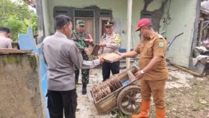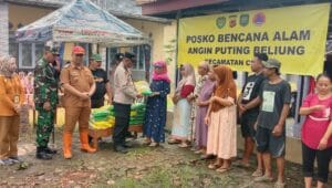 Terlihat Kepolisian Sektor (Polsek) Ciasem bersama Muspika menyalurkan bantuan sosial langsung kepada warga yang terdampak bencana angin puting beliung.