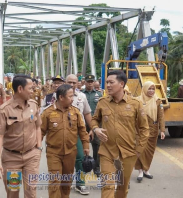 Bupati Pesisir Barat (Pesibar), Dedi Irawan, meninjau pengerjaan perbaikan Jembatan Way Pintau Kecamatan Bangkunat yang mengalami kerusakan berat pasca diterjang banjir.