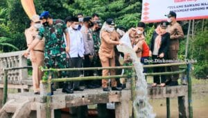 Tulang Bawang-koranlibasnews.com Tebar benih ikan nila Nirwana di tangga raja sungai Tulang Bawang dilaksanakan ibu bupati Tulang Bawang Dr Hj Winarti SE MH dalam rangka menyambut HUT Kabupaten Tulang Bawang ke – 25 tahun 2022, Selasa 1/3/2022