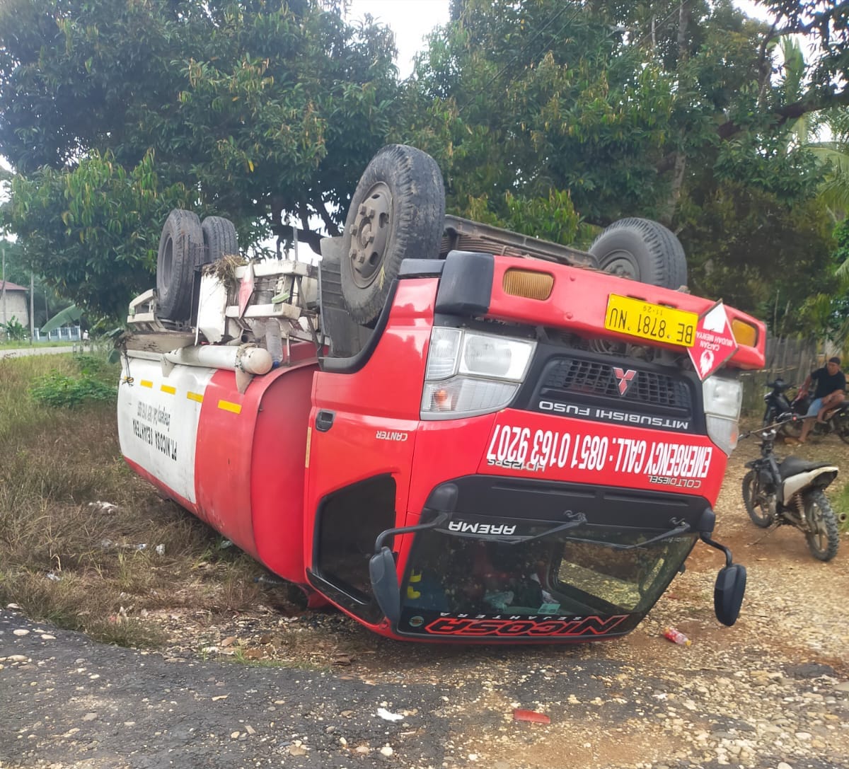 MERANGIN-Koranlibasnews.com Insiden kecelakaan tunggal yang mencekam terjadi di ruas Jalan Lintas Sumatera, Limbur Merangin, pada Minggu (26/04/2026). Sebuah truk pengangkut Bahan Bakar Minyak (BBM) terbalik berulang kali setelah mengalami kegagalan fungsi kemudi secara mendadak