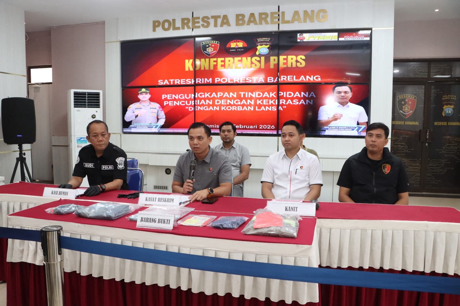 Batam-Koranlibasnews.com Polresta Barelang melalui Satuan Reserse Kriminal menggelar konferensi pers terkait pengungkapan tindak pidana pencurian dengan kekerasan yang terjadi di wilayah Lubuk Baja. Kegiatan tersebut dipimpin langsung oleh Kasat Reskrim Polresta Barelang Kompol M. Debby Tri Andrestian, S.I.K., M.H.Li., didampingi oleh Kasihumas Polresta Barelang AKP Budi Santosa, S.H., Kanit Reskrim Polsek Lubuk Baja Iptu Noval Adimas Ardianto, S.Tr.K., M.H., serta Kasubnit Opsnal Satreskrim Polresta Barelang Iptu Maryo Sandro Putra Siahaan, S.I.Kom. Konferensi pers dilaksanakan di Lobby Polresta Barelang, Kamis, (12/02/2026).