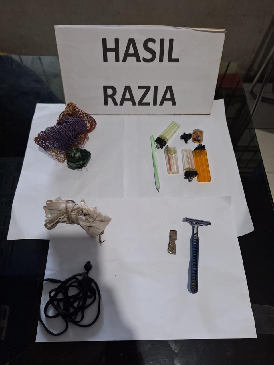 Dalam pelaksanaan razia, ditemukan beberapa barang yang bisa saja menimbulkan gangguan keamanan dan ketertiban, diantaranya : 3 utas tali ukuran kecil, 2 buah pulpen, 4 buah korek api bekas serta 1 buah cukuran jenggot;