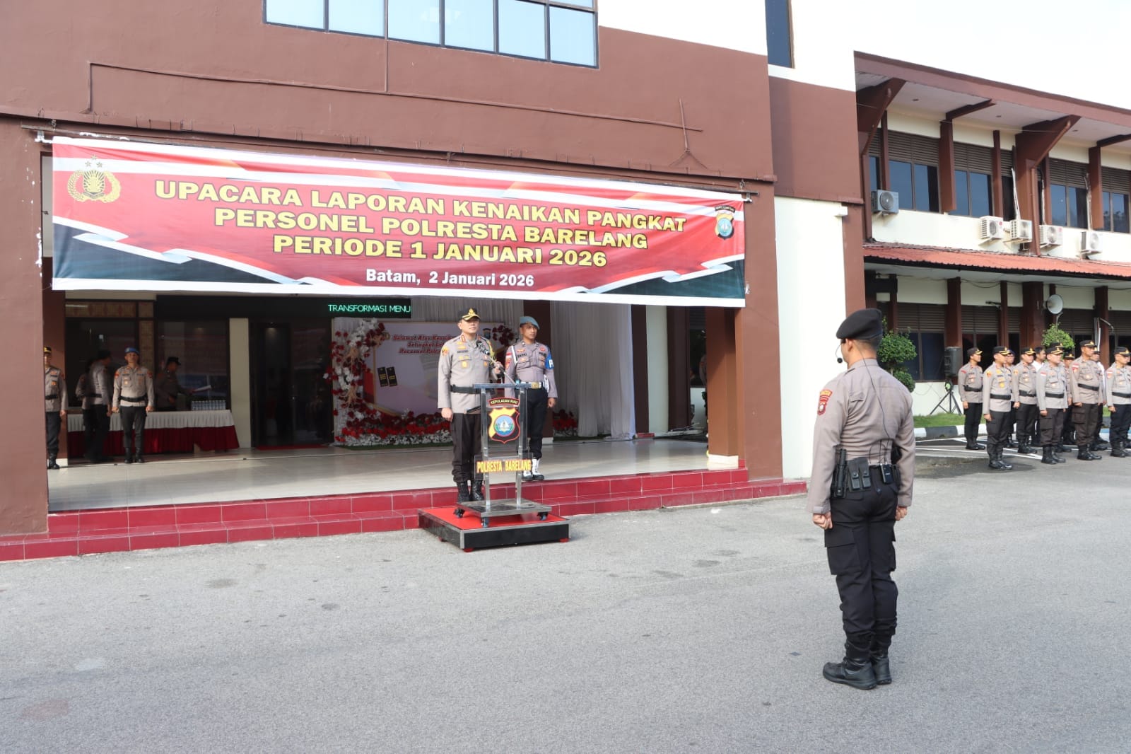 Upacara tersebut dipimpin langsung oleh Kapolresta Barelang Kombes Pol Anggoro Wicaksono, S.H., S.I.K., M.H. selaku Inspektur Upacara, dan diikuti oleh Wakapolresta Barelang AKBP Fadli Agus, S.I.K., M.H., M.M. Pejabat Utama Polresta Barelang, Kapolsek jajaran, Bhayangkari Polresta Barelang, serta seluruh personel Polresta Barelang yang menerima kenaikan pangkat.