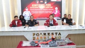 Barelang – Satuan Reserse Kriminal Polresta Barelang menggelar konferensi pers terkait pengungkapan tindak pidana pencurian dengan kekerasan yang terjadi di wilayah Bengkong, Kota Batam. Kegiatan tersebut dilaksanakan di Aula Wicaksana Laghawa Lantai 2 Polresta Barelang dan dipimpin langsung oleh Kasat Reskrim Polresta Barelang Kompol M. Debby Tri Andrestian, S.I.K., M.H.Li., didampingi Kasi Humas Polresta Barelang AKP Budi Santosa, S.H., Kanit IV Jatanras AKP Doddy Masyir, S.H., M.H., serta Kasubnit 8 Satreskrim Polresta Barelang Iptu Maryo Sandro Putra Siahaan, S.I.Kom, pada Selasa (03/03/2026).