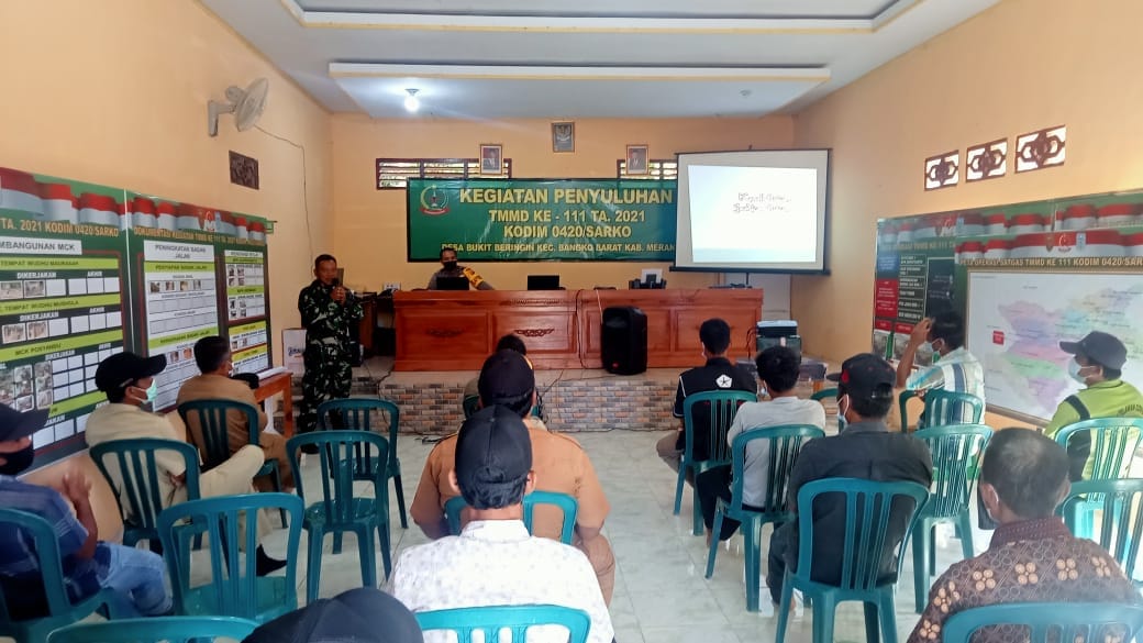 Dalam rangka kegiatan Non Fisik TMMD Ke 111 Kodim 0420/Sarko Satgas TMMD 111 bekerjasama dengan Polres Merangin berikan penyuluhan Hukum dan Kamtibmas yang bertempat di Balai Desa Bukit Beringin Kecamatan Bangko Barat Kabupaten Merangin Jambi, Senin (28/06/2021).