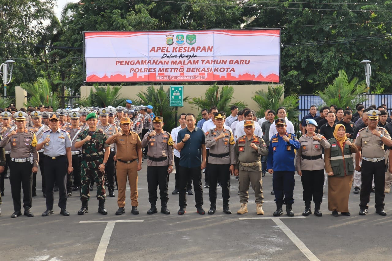BEKASI-koranlibasnews.com Dalam rangka mengamankan malam pergantian tahun baru 2025 dan rangkaian Operasi Lilin Jaya 2024, Polres Metro Bekasi Kota menggelar apel pasukan tiga pilar di halaman Mapolres Metro Bekasi Kota, Sabtu (31/12/2024).